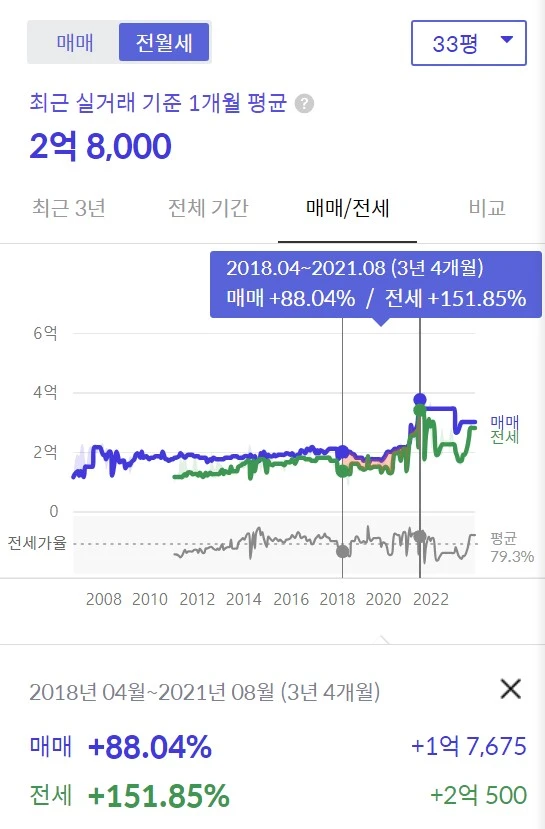 2018년~2021년 매매가가 치솟던 시기에는 매매가가 오르는 것보다 전세가가 더 올랐다. 집값이 오르는 만큼 전세가가 같이 따라오른다는 것은 이 집에 살고 싶긴 해도 사고 싶은 곳은 아니라는 의미이다. 이런 아파트는 당연히 환금성도 떨어지며 집값도 웬만해선 잘 오르지 않는다.