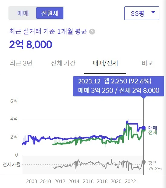 이 단지를 보면 2010년 이후로 매매가와 전세가 간의 격차가 벌어진 적이 없다. 현재 전세가율은 92.6%로 갭은 겨우 2,250만원이다. 2,250만원만 있으면 자가를 구입할 수 있는건데 매수하는 사람이 없다.