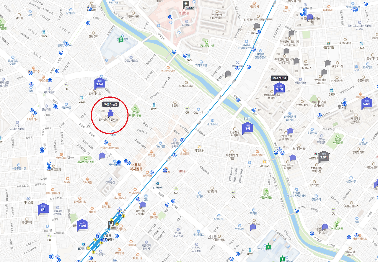 칸타빌수유팰리스는 아파트 이름에는 '수유'가 들어가있지만 실질적으로 수유역에서는 조금 떨어져있다. 물론 도보 8분 거리라서 도보로 지하철을 이용하는데에는 문제가 없지만 대로변도 아니고 골목 안쪽에 있어 약간 애매한 위치라고 할 수 있다.