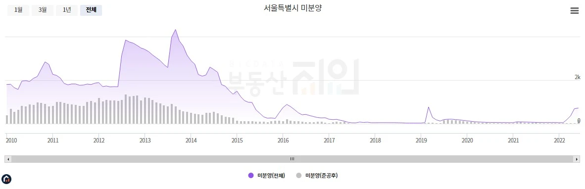 전국의 미분양이 올해 3월부터 늘어난 것은 사실이지만 과거에 비하면 아직도 한참 낮은 수준이다. 서울은 2016년 하반기부터 미분양이 거의 0에 가까운 수준이었다가 최근들어 고개를 들고 있다. 하지만 그마저도 부동산 침체기였던 2010년대초반의 미분양에 비하면 새발의 피다. 즉, 최근 미분양이 증가한 것은 맞지만 미분양이 '쌓인다'고 표현할 정도로 엄청난 양은 아니라는 의미다.