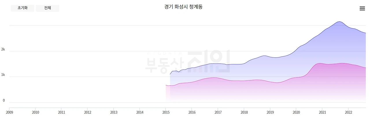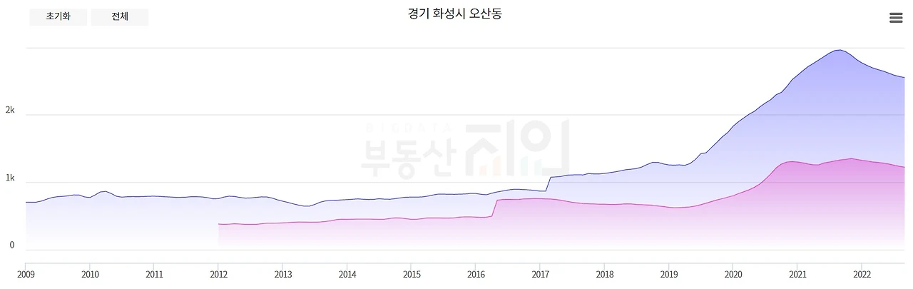 그렇다보니 오산동과 청계동 모두 최근 매매, 전세 모두 조정을 받고 있다. 과거 시세를 보더라도 엄청난 물량이 쏟아지기 시작했던 2017년부터 2019년까지 전세가가 쭉 하락하는 모습을 볼 수 있다.