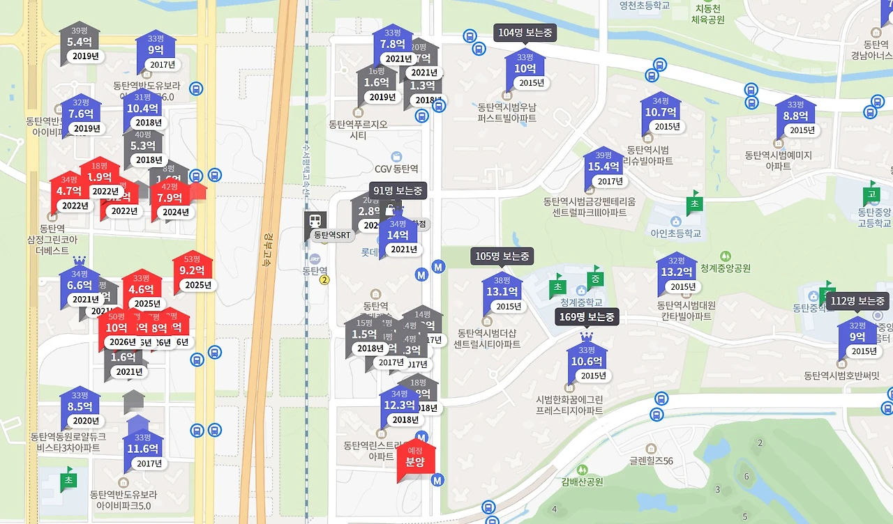 동탄 또한 최근에 많이 빠진 지역 중 하나이다. 고점대비 거의 30% 가까이 빠져서 현재 시세는 20년 7~8월 즈음과 비슷해졌다. GTX-A노선 호재로 집값이 붕 떴기에 하락폭이 더 가파를 수도 있지만 아직 소화되지 못한 물량과 앞으로 예정된 공급 물량도 시세 하락을 견인한 요인 중 하나이다. 동탄의 메인 지역은 GTX-A노선이 들어서는 동탄역 주변인 청계동과 오산동이다. 지도로만 봐도 알 수 있지만 2022년~2026년까지 입주 예정 단지들이 대략 10개 단지 정도이다.