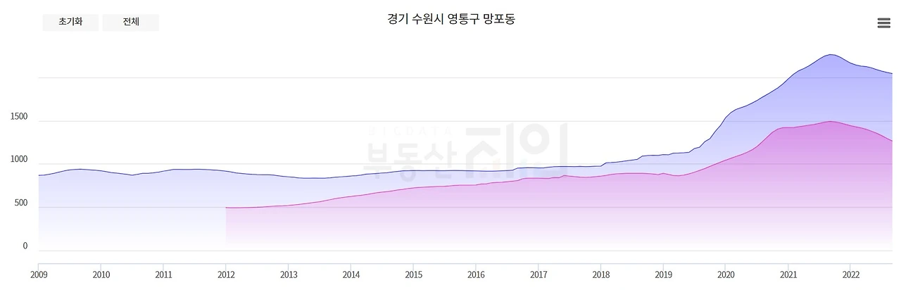 이런 상황이다보니 2021년 하반기 매매가와 전세가 모두 정점을 찍고 급격하게 하락 중이다. 특히 매매보다 전세가 더 큰 폭으로 하락하고 있다.