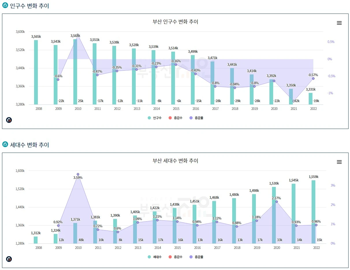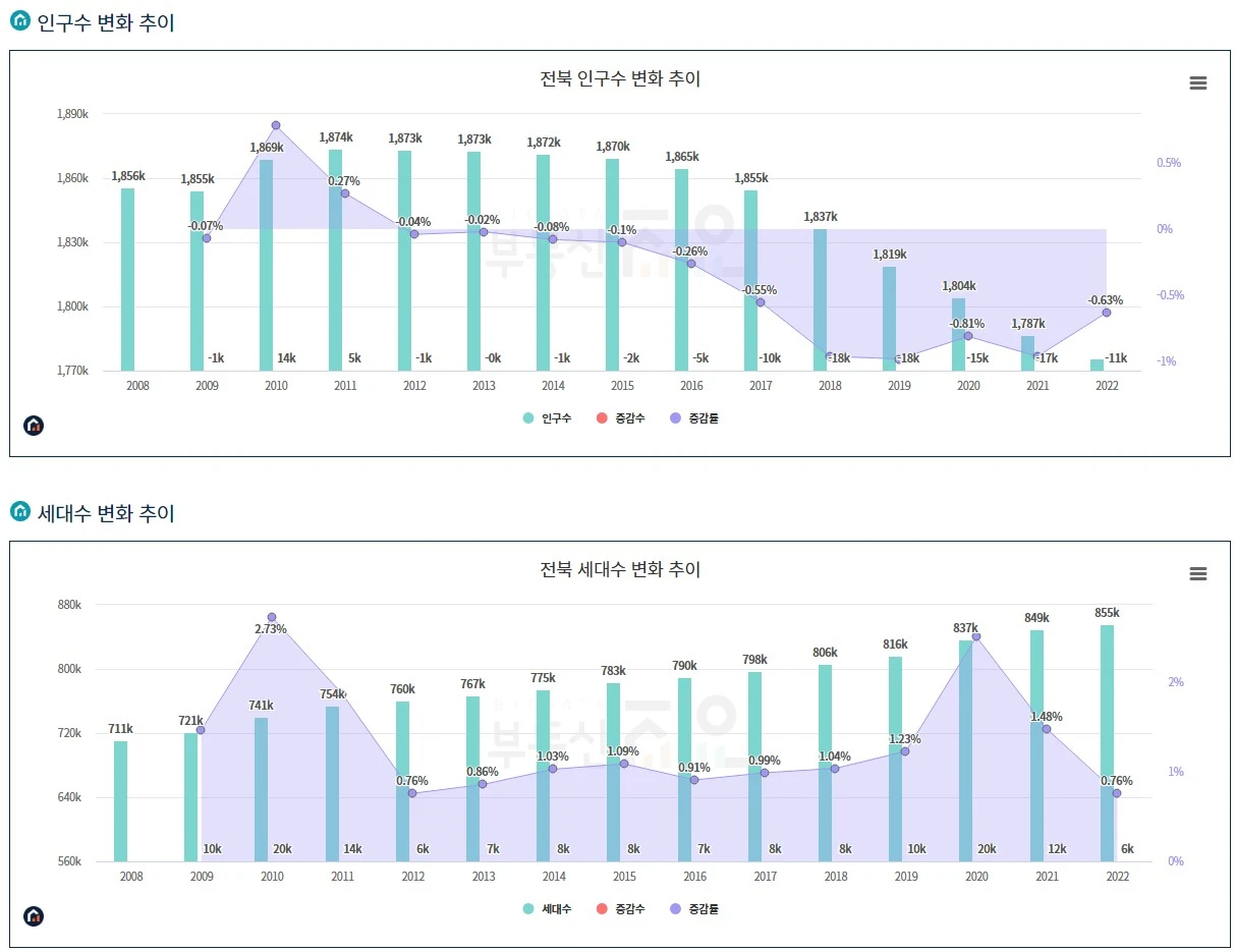 이런 현상은 서울에만 국한된 것이 아니라 지방에서도 쉽게 찾아볼 수 있는 현상이다. 부산광역시는 인구수가 2010년부터 급감했지만 세대수는 인구 감소 속도보다 더 빠르게 늘어나고 있다. 인구수가 최저점을 찍은 2022년 현재 세대수는 최고점이다. 광역시가 아닌 지방도 마찬가지이다. 전북 역시 2018년부터 매년 인구가 급감하고 있지만 세대수는 증가하고 있다.