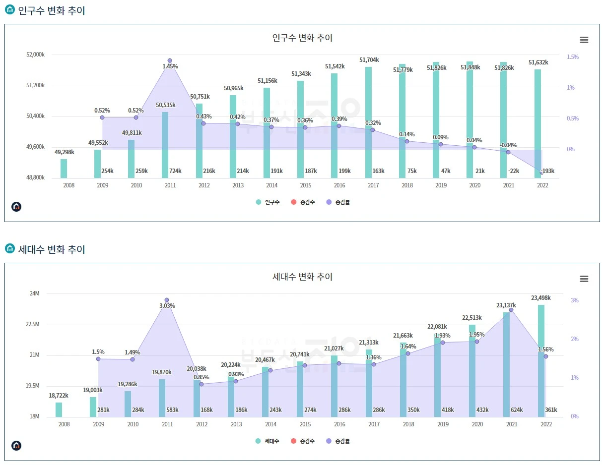 전국의 인구수는 조금씩 줄어들고 있지만 세대수는 지난 12년간 지속적으로 큰 폭으로 늘어났다. 인구 성장이 정체되었던 2018~2021년에도 세대수는 매년 2% 가까이씩 증가해왔다. 1인가구의 증가뿐만 아니라 이혼율 증가로 인한 가정의 해체, 외국인가구의 증가 등으로 세대수는 꾸준히 증가하고 있다.
