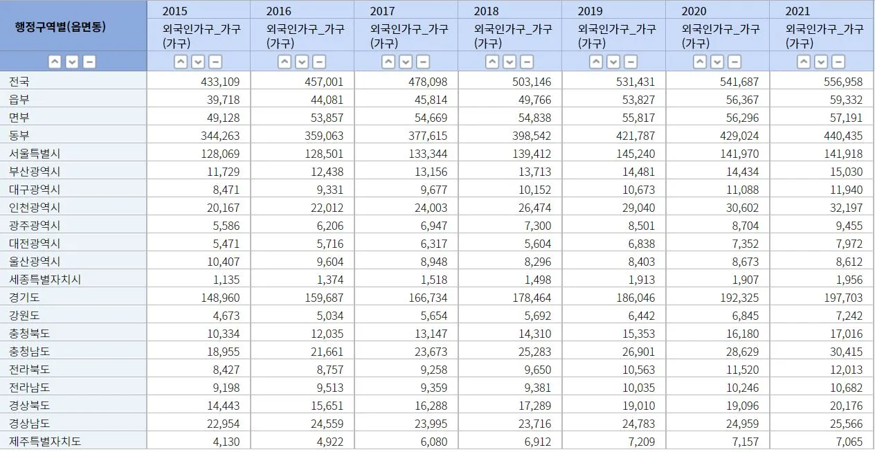 2015년 외국인 가구는 약 43만 가구였다. 이후 지속 증가해 2021년에 55.7만 가구가 되면서 6년간 약 13만 가구가 증가했다. 즉, 일반가구에 외국인가구와 집단가구까지 포함한다면 통계청에서 발표하는 가구 추계보다 훨씬 많은 가구가 대한민국에 살고 있고 가구수는 인구가 감소하고 있음에도 불구하고 꾸준히 증가하고 있다.