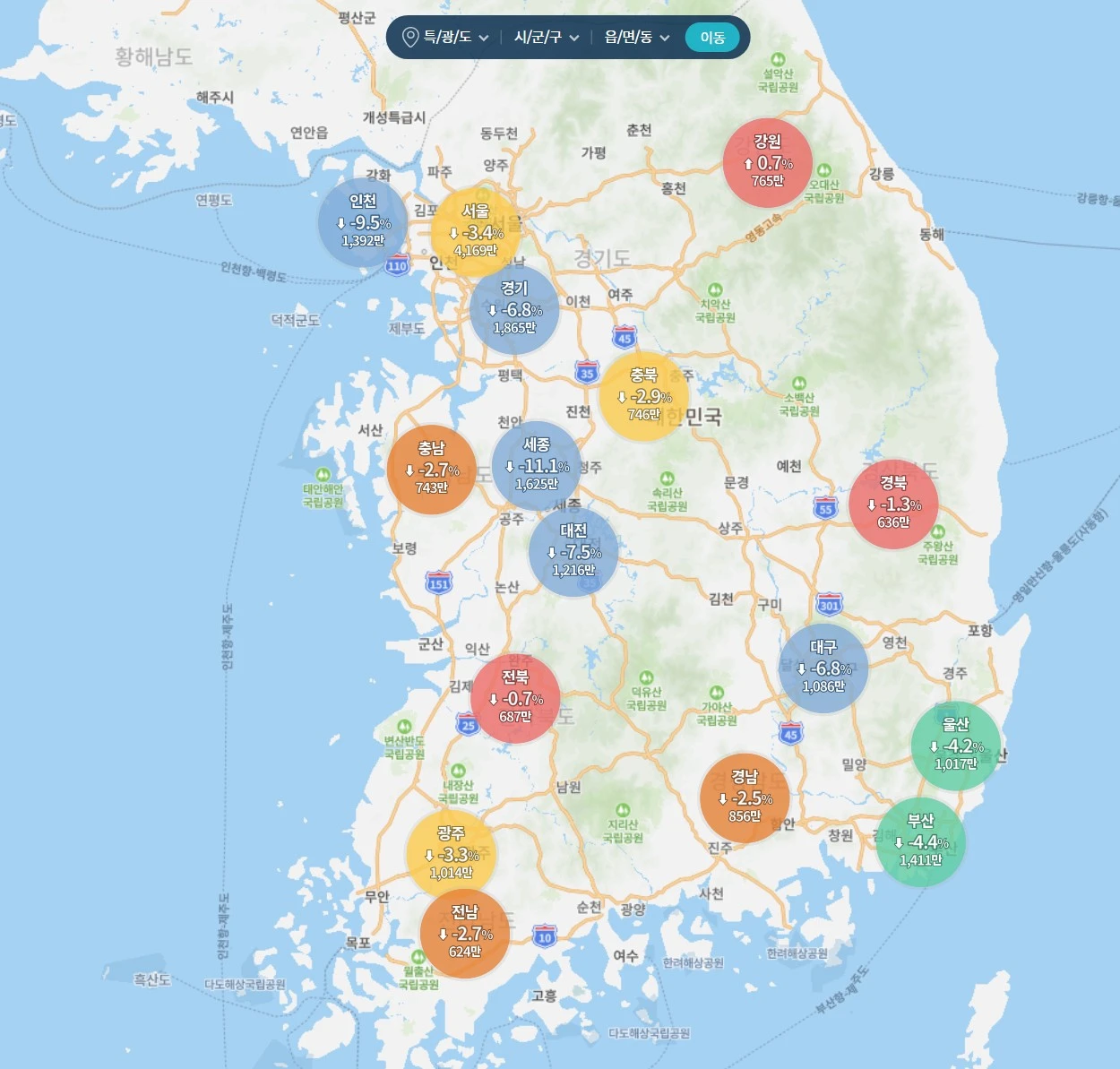 게다가 현재 전국의 시세가 모두 하락세이다. 특히 대전, 대구, 인천, 세종 등의 하락폭이 심하며 서울과 경기도 완연한 하락세이다. 지역을 막론하고 고점 대비 20~30% 이상 하락하지 않은 단지를 찾기가 어려울 정도이다. 웬만큼 가격을 낮춘 급매가 아니라면 거래도 거의 되지 않고 그런 급매조차 빠르게 소화되지 않는 시장이다.