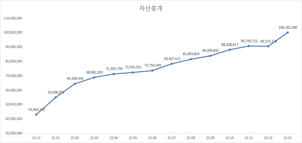 높은 저축률도 한 몫했지만 이직도 큰 역할을 했다. 우선 이직 타이밍을 잘 잡은 덕에 전 회사에서 성과급을 두둑히 챙겨나올 수 있었다. 천만원이 넘는 성과급과 1월 한달 급여, 연차수당 등을 합하니 1월에 전직장에서 받은 원천징수액이 2천만원이 넘었다. 원천징수액에 들어가지 않는 퇴직금을 합치면 세후 수령액이 2천만원 정도였다. 그 덕에 22년 1,2월에 자산 총계가 급격하게 상승했다.