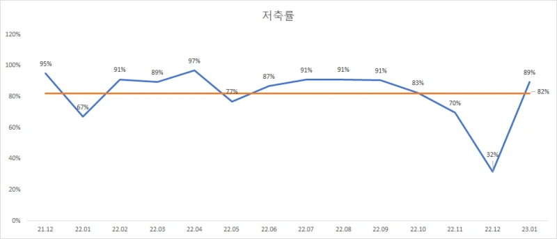 지난 1년 간 내가 지켜온 평균 저축률은 82%정도이다. 11, 12월에는 유난히 저축률이 낮았는데 결혼 비용 지출과 부모님 선물 때문이었다. 그런 큼직한 이벤트가 있는 경우를 제외하고는 정말 높은 수준의 저축률을 유지해왔다.