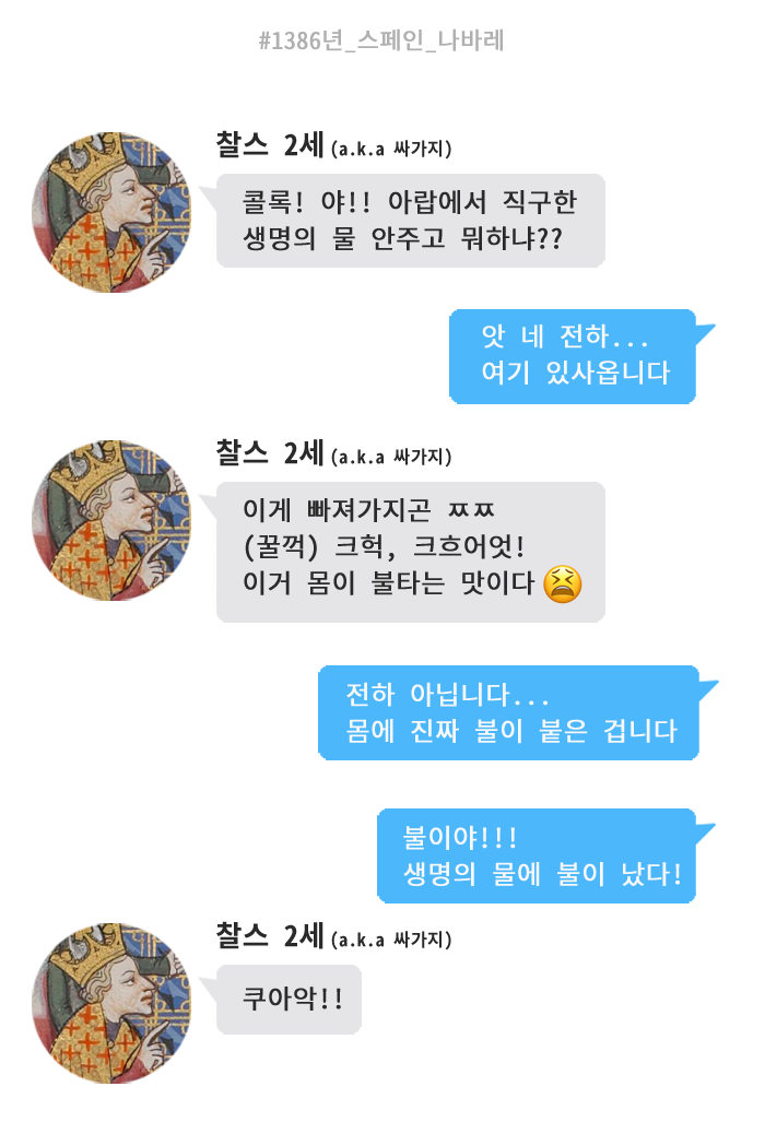 아쿠아비테를 마신 찰스는 목에서 타는 듯한 감각을 느낀다. "크헉! 이것은 마치 신의 심판 같구나!" 하지만 목만 타는 게 아니었다. 시종의 실수로 촛불이 아쿠아비테와 국왕의 옷에 옮겨 붙은 것. 참고로 증류주의 또 다른 이름은 아쿠아 아르덴스(aqua ardens)로 '불타는 물'이란 뜻이다. 저승이라는 새로운 세상을 발견한 찰스에게 안부를.