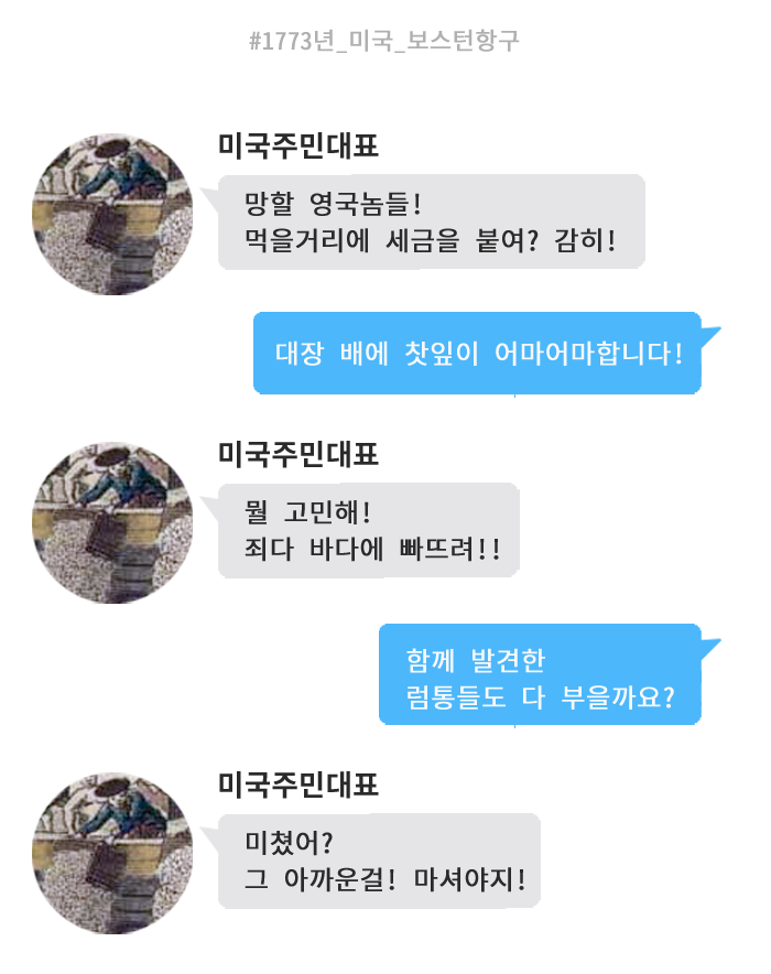 1764년 영국정부는 당밀조례를 더욱 강화시켜 세금을 모두 거둬드리기로 했고, 밀수업자들을 체포하기 시작했다. 미국주민들의 불만은 폭발했다. 1765년에는 인쇄물에 세금을 붙이는 인지조례, 1773년은 그 유명한 차 조례가 생기자 지역주민들은 보스턴 항구에 들어온 3척의 선박에 있는 차들을 바다에 빠뜨렸다. 역사는 차를 미국독립운동의 씨앗으로 보지만, 그 이전에 럼이 있었다.