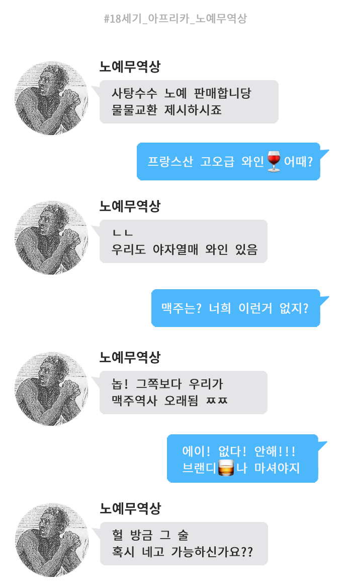 아프리카 노예상들은 물물교환 형식으로 노예를 제공했다. 옷감, 그릇 등 다양한 물품 들 속에서도 그들이 원한 것은 술이었다. 그것도 강한 술. 이미 아프리카인들은 야자열매로 담은 와인 그리고 다양한 맥주를 마시고 있었다. 하지만 '화끈한' 브랜디는 그들이 가져보지 못한 가치있는 음료였다.