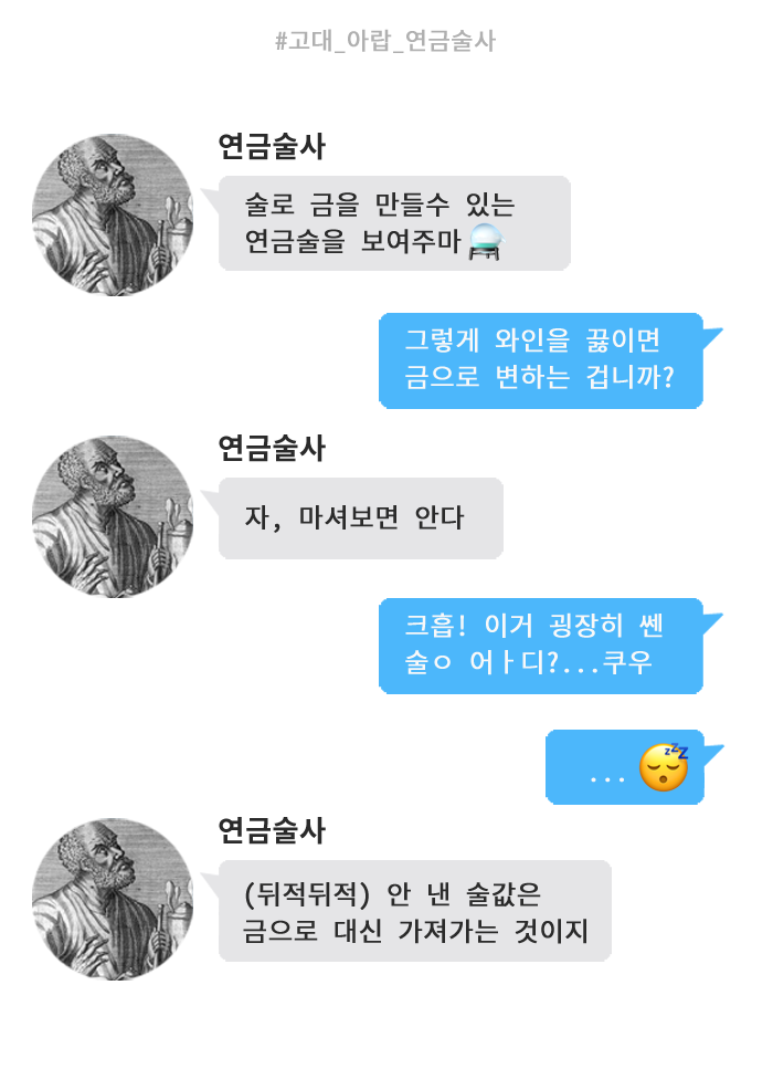 하지만 정작 아랍의 연금술사는 증류된 와인을 대수롭지 않게 여겼다. 심지어 음료수로 여기지도 않았는데 그들은 약품이나 소독 정도로 사용할 수 있을 것이라 생각했다. 아무리 그들의 최종 관심사가 쇠를 금으로 바꾸는 것이라지만, 한번쯤 마셔봤으면 가치를 알았을텐데. 범생이들이란.