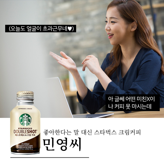이토록 퍽퍽한 회사를 다니는 이유는 단 하나다. 회사 유일의 예쁨형 인간 민영씨 때문이다. 이 무지막지한 콘크리트라는 철창에 갇힌 가여운 아기새. 당신과 함께 스타벅스에 날아가고 싶다는 수줍은 마음을 담아 오늘 아침에도 '스타벅스 에스프레소&크림 커피'를 책상 위에 두고 왔다.