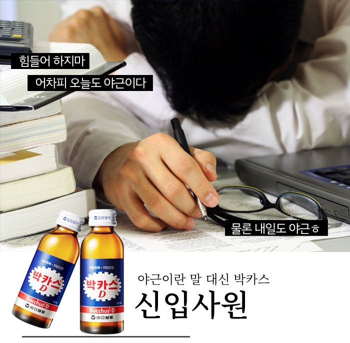 하지만 이게 다가 아니다. 나는 오늘 녀석을 위해 박카스를 1박스나 준비했거든. 2시간에 한 번씩 신입사원 앞에 나타나 박카스D를 스윽 꺼내 준다. 해는 진작 저물었지만, 나는 야근이라는 말 대신에 박카스D를 스윽 꺼내어 준다. 참고로 박카스 1박스는 10병이다.