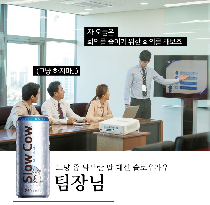 그래서 준비했다. 마취제... 아니 '슬로우카우'를. 회의와 논쟁을 즐겨하는 사람도 그냥 예쓰맨으로 만들어 버릴 정도로 신경을 안정시켜 준다. 편한 사무실 의자에 앉아서 슬로우카우를 마시는 그를 상상해본다. 팀장님의 회의진행소리가 아닌 낮은 코고는 소리를. 이게 바로 평화, 요순시대가 아니고 무엇이겠는가.