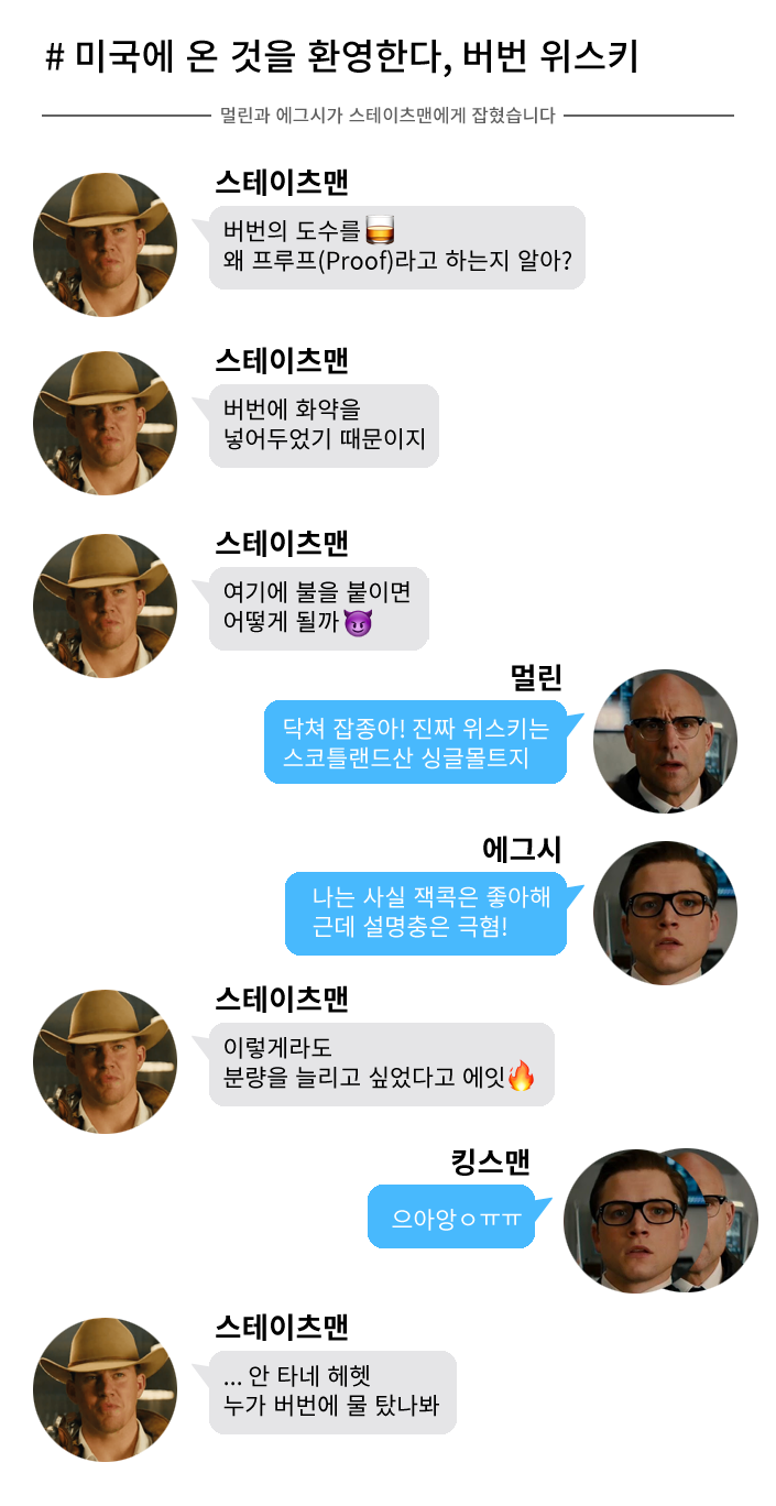 간지 나게 마티니를 마시는 것도 잠시. 킹스맨2는 시작부터 시원하게 킹스맨 본부를 미사일로 날려버리면서 시작한다. 집도, 동료도, 강아지도 잃은 에그시가 할 수 있는 일은 또 다른 생존자인 멀린과 술을 마시는 것이다. 그런데 이 술. 와인도 싱글몰트도 브랜디도 아닌 버번이다. 가장 영국적인 영화에 미국의 술이라고?