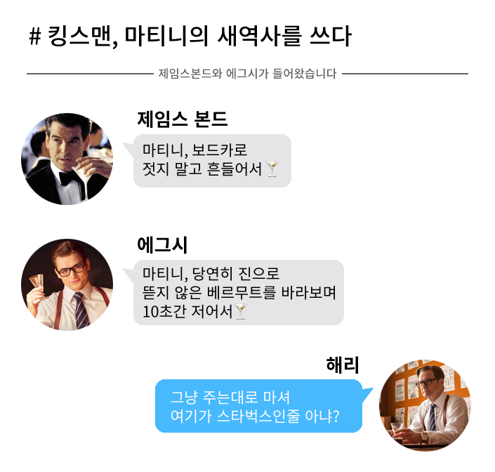 결국 킹스맨은 동네 양아치였던 에그시가 자신만의 진정한 마티니 레시피를 찾는 영화라고 볼 수 있다. 본드 이후에 수많은 영화에서 마티니를 마셨지만, 그를 대체할 사람은 에그시가 아닌가 싶다. 킹스맨2에서도 에그시는 종종 마티니를 찾는다. 요즘 본드형은 맥주 마시던데(ㅠ)