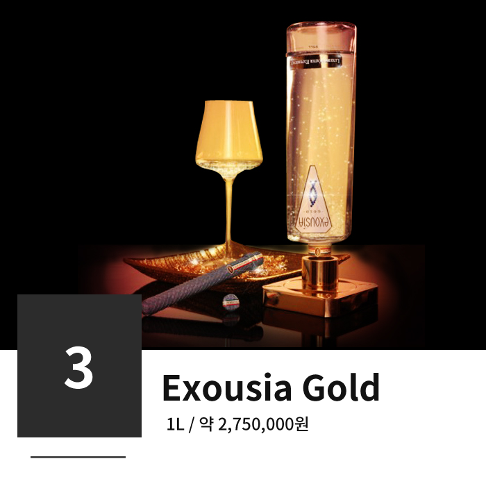금을 통해 정제된 엑소시아 골드에는 스트레스를 줄이고, 노화를 방지해주는 효능이 들어있다고 한다. 하지만 금도 마실 수 있을 정도의 재력이 있는 사람에게만 해당될 것 같다. 일반인이 이걸 마셨다가는 스트레트는 물론 어마어마한 가격에 폭삭 늙을 수도 있으니까.