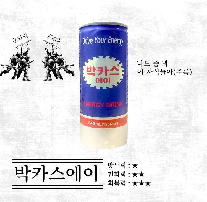대한민국을 대표하는 에너지 음료는 박카스다. 그런 박카스가 군인 에디션으로 나오고 있다. 바로 박카스 에이! 군인(Army)의 줄임말인지, 알루미늄(Aluminium)의 줄임말인지 모르겠지만. 한국에서는 군대에서만 구할 수 있고, 알루미늄 캔으로 포장이 되어있다.