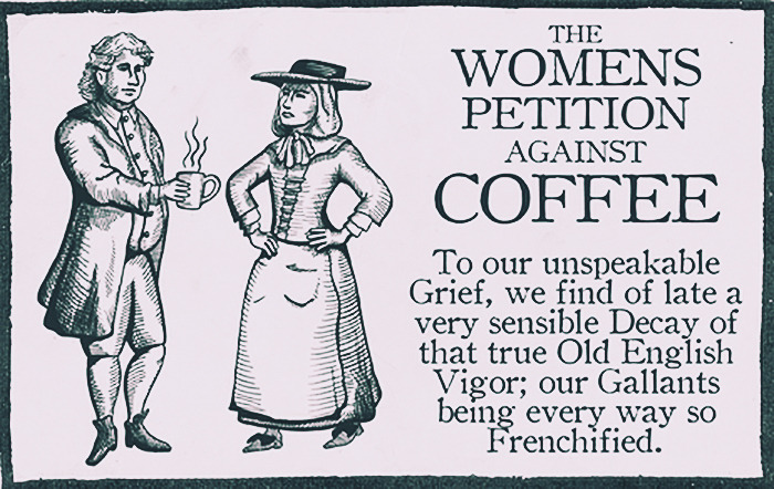 즉. 그녀들은 커피를 비난하면서 남성들만 향유하는 문화 전반에 대한 비판을 가한 것입니다. 어떻게 보면 여성인권운동의 시작이라고 볼 수 있겠지요. 하지만 비판이 날로 강도가 세지며 커피에 대한 루머를 씌우게 됩니다. "커피를 마신 영국남자들의 정력이 프랑스 남성만큼이나 형편없어졌다" 의문의 프랑스인 1패.