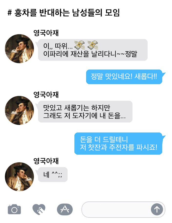 남성들은 불만이 쌓이게 됩니다. "이따위 이파리에 돈을 쓰다니!" 하지만 맛있으니까 홀짝 합니다. 또한 겹겹이 쌓인 중국산 도자기(그때는 메이드 인 차이나가 가장 비쌉니다)를 보며 "이것들이 내 재산에 막대한 손해를 입히고 있다"라고 말합니다. 그런데 나보다 높은 계급의 사람이 도자기를 보며 교양을 칭찬합니다. 이럴 수가.