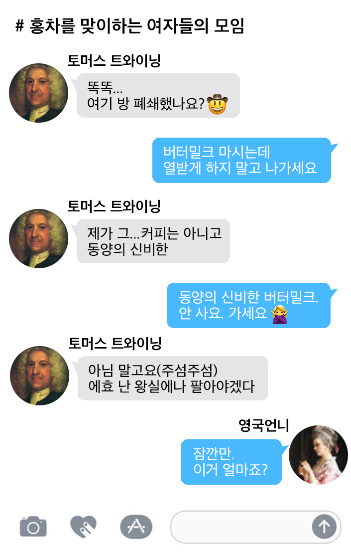 물론 이전에도 홍차는 커피하우스를 통해 구입을 할 수 있었습니다. 하지만 1717년 로버트 트와이닝이라는 상인이 집에서 마실 수 있는 '차 세트(홍차+도자기)'를 판매한 것입니다. 트와이닝이라는 차 브랜드는 영국의 가정에 들어오게 되며 성공가도를 달리게 됩니다.