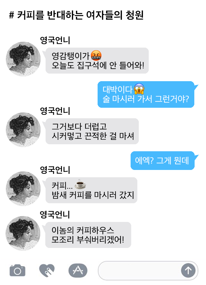 17세기 런던. 부인들이 모여 하나의 물건에 손가락질을 하고 있습니다. "이 비열하고, 시커멓고, 끈적끈적하며, 불결하고, 쓰고, 짜증 나는 냄새가 나는 더러운 물!" 바로 커피입니다. 심지어 17세기는 커피를 못 마시면 교양인 취급을 받지 못하던 시대였는데 말이죠.