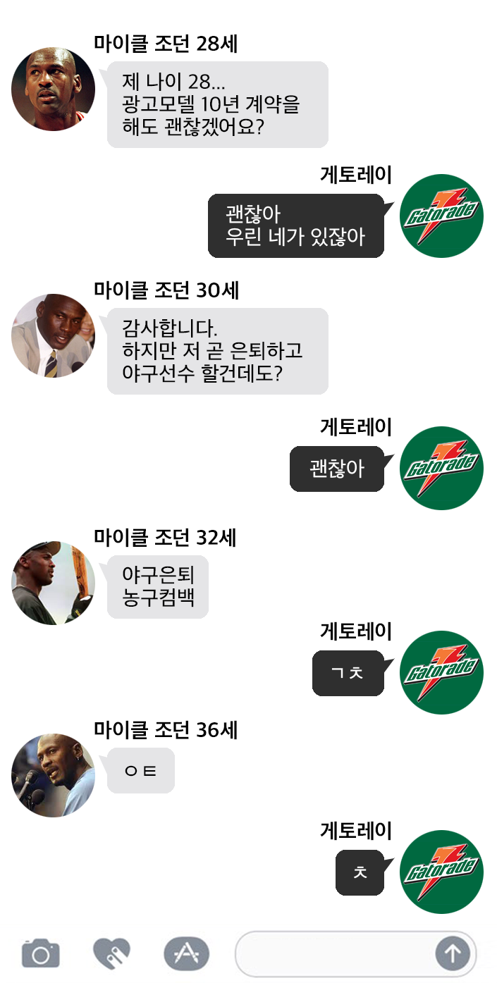 농구황제 '마이클 조던(Michael Jordan)'을 생각하면 나이키를 떠올린다. 하지만 게토레이는 조던의 어린 시절부터 함께한 음료다. 그런 그가 게토레이와 계약하는 것은 당연한 수순이었다. 게토레이는 마이클 조던이 코카콜라와 계약이 끝나는 날만 기다렸다. 그의 나이 28살. 게토레이는 드디어 원하는 광고모델을 찾았다.