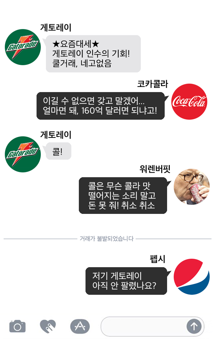 결국 남은 것은 인수밖에 없었다. 코카콜라에서는 160억 달러에 게토레이 제작사 퀘이커 오츠를 인수하려 했다. 하지만 대주주인 '워렌 버핏(Warren Buffett)'의 반대로 무산. 결국 뒤를 이은 펩시가 게토레이를 인수했다. 결과는 모두가 알 것이다. 워렌 버핏의 이불킥 역사 중 하나가 게토레이를 찬 거란걸.