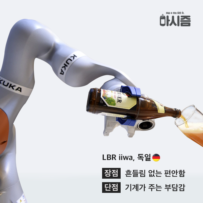 사실 이 녀석은 산업용 로봇이다(쿠카로보터는 세계 1위의 산업용 로봇회사). 하지만 기계를 조립하는 것 외에도 성능의 우수함을 어필해야 했다. 그래서 공장에서 기계를 조립하던 로봇팔로 맥주를 따라주기 시작했다. 본격 친화력 갑. 회사생활에서 맥주 한 잔 잘 따르면 충분하지 뭐.