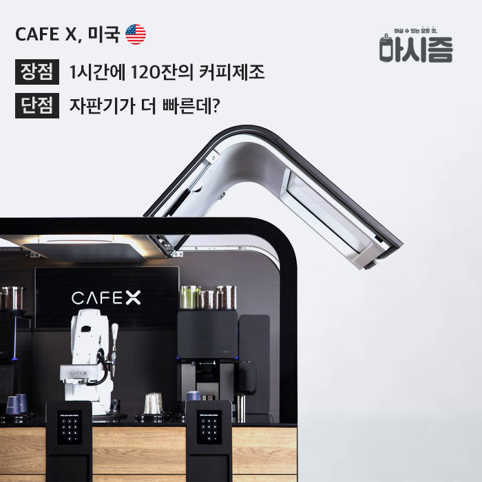 바리스타 로봇 '카페X(Cafe X)'는 그렇게 태어났다. 스마트폰으로 주문을 하면 메뉴부터 원두까지 맞추어 커피를 제조해준다. 무려 한 시간에 120잔을 만들 수 있다. 커피를 받아가면 손까지 흔드는 여유를 보여준다. 그 시간에 커피를 만들면 130잔도 가능할 텐데 말이다. 아직 한국의 자판기를 따라가려면 멀었다. 분발해라 카페X.