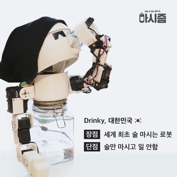 대한민국에서 가장 유명한 음료로봇. 그것은 '드링키(Drinky)'다. 세계 최초 술 마시는 로봇이다. 그 누구도 로봇으로 술을 만들 생각만 했지, 마실 생각은 못했다. 제작자인 박은찬씨도 여자친구 없는 크리스마스에 혼자 소주를 마시다가 만들었다고 하니. 알고 보면 슬픈 녀석이다.
