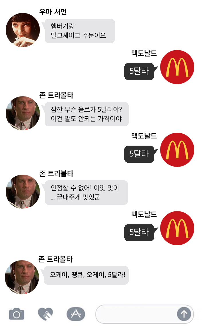 맥도날드에서 우마 서먼과 존 트라볼타가 만나는 장면이었어요. 우마 서먼이 밀크셰이크를 주문하는데 가격이 무려 '5달러(당시 환율을 계산하면 만원쯤이라고 생각)'였지요. 존 트라볼타가 놀라서 밀크셰이크를 한 입 쪽 빠는데. 맙소사. 너무 맛있는 거죠. 인정. 5달러 인정.