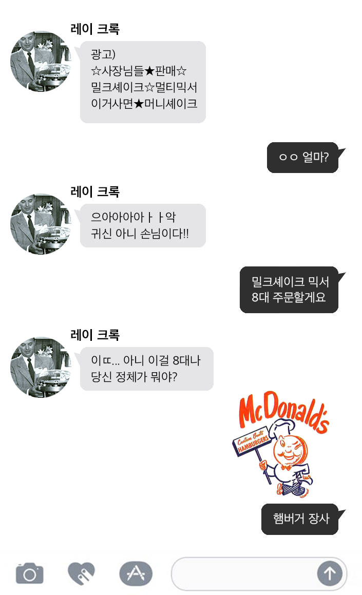 밀크셰이크씨. 우리는 밀크셰이크를 판매하는 영업사원 중 한 명을 잊을 수 없지요. 바로 레이 크록(Ray Kroc)이에요. 17년간 종이컵을 팔다가 당신을 만나고 17년간 밀크셰이크 믹서기를 판 중년의 영업맨을 말이죠.