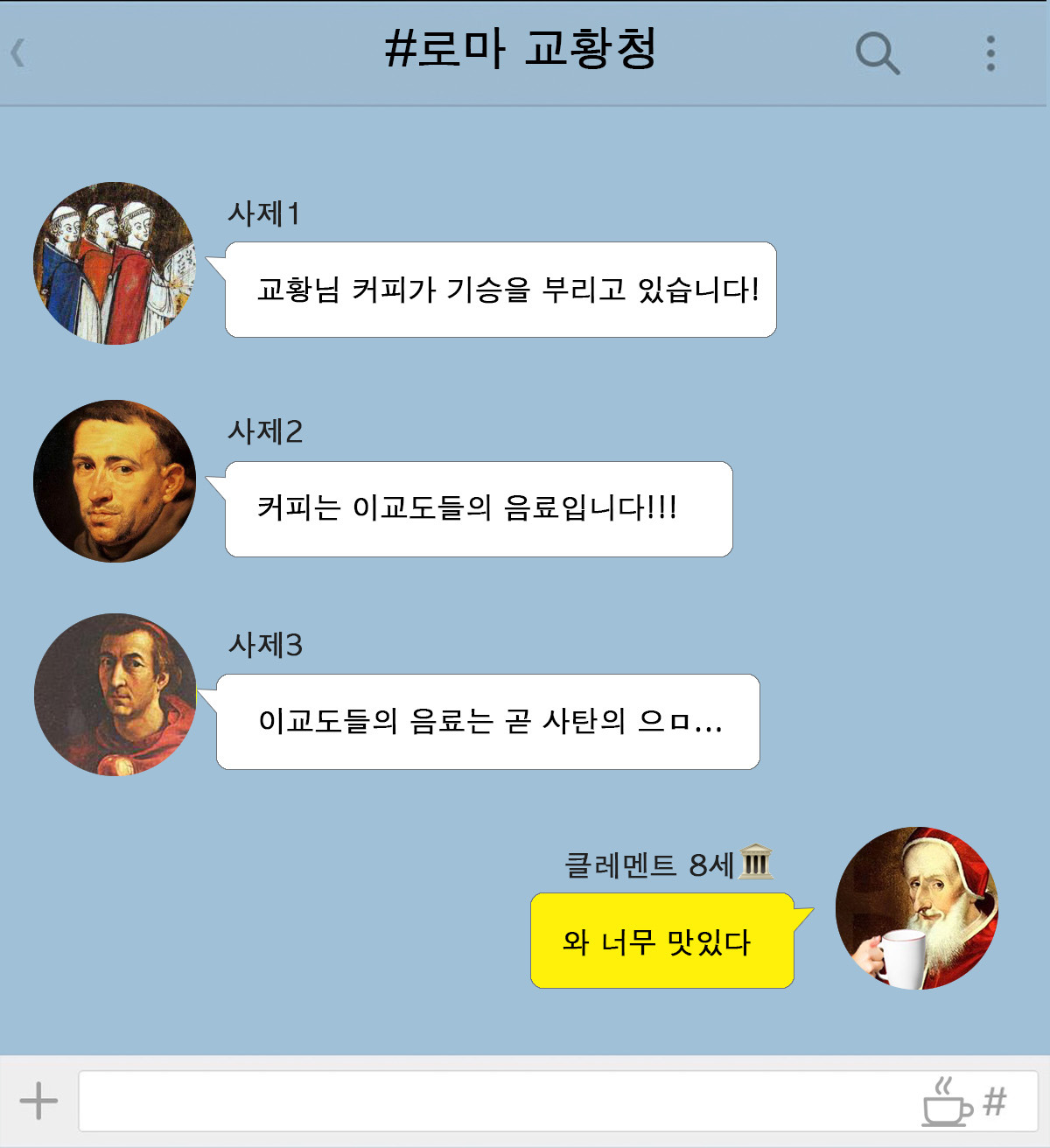 그들은 이교도들이 즐겼던 커피를 악마의 음료라고 불렀다. 그리고 교황이었던 클레멘트 8세에게 사악한 커피를 금지시켜달라는 청원을 한다. 그는 결정을 내리기 전 커피의 맛을 보았다.