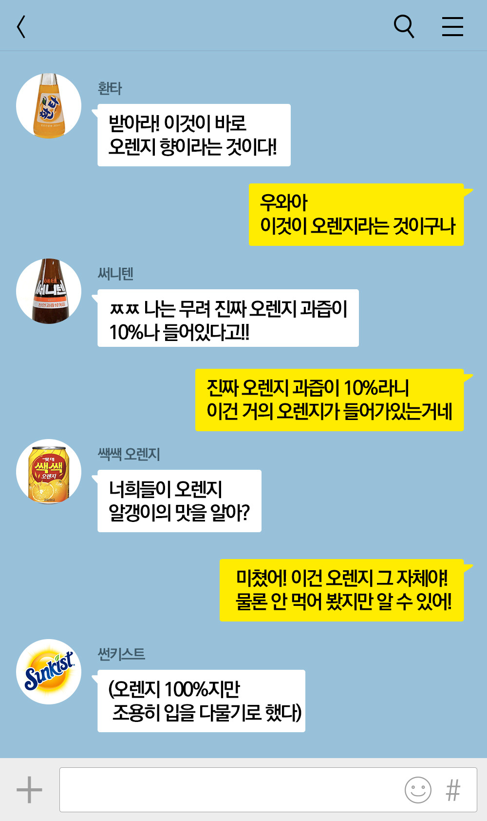 하지만 이런 오렌지주스가 대한민국 땅을 밟을 때까지는 시간이 필요했다. 애초에 오렌지도 낯선 과일이었다. 한국음료계에서 오렌지주스란 분말형태로 만들어진 파우더 정도였다. 1968년 '환타'가 내한하기 전까지는. 단지 오렌지향을 첨가했을 뿐인데 환타의 인기는 대단했다. 1976년에는 오렌지 과즙을 무려 10%나 함유한 써니텐이 나왔고, 1980년에는 오렌지 과립이 들어간 쌕쌕 오렌지가 나왔다. 와 이쯤 되면 정말 오렌지 아니냐?