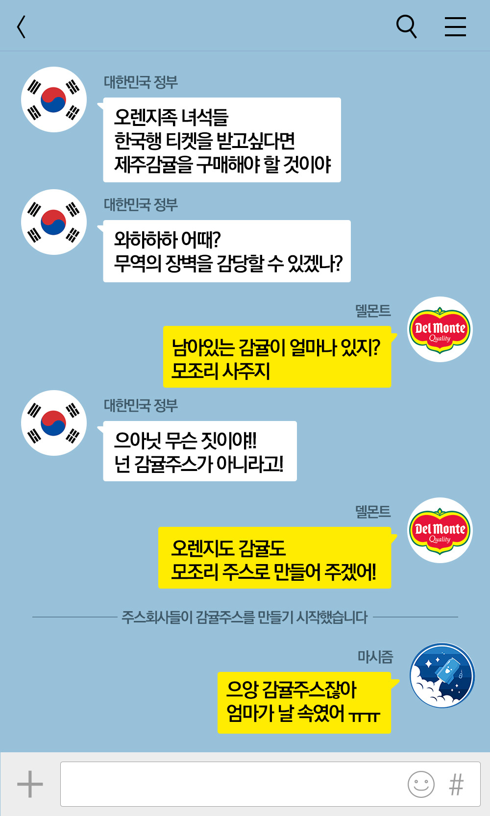 이러자 해태와 롯데는 장외경기로 감귤 확보 전쟁을 해야 했다. 1989년에 감귤농사가 흉년이 들자 품질이 떨어지는 감귤까지도 모두 음료회사들이 구매할 정도였다. 이토록 많이 구매한 감귤들은 역시 주스가 되고, 보다 저렴한 가격으로 시장에 나오고, 아무것도 모르는 내 입에 들어간 것이다(물론 맛있었다).
