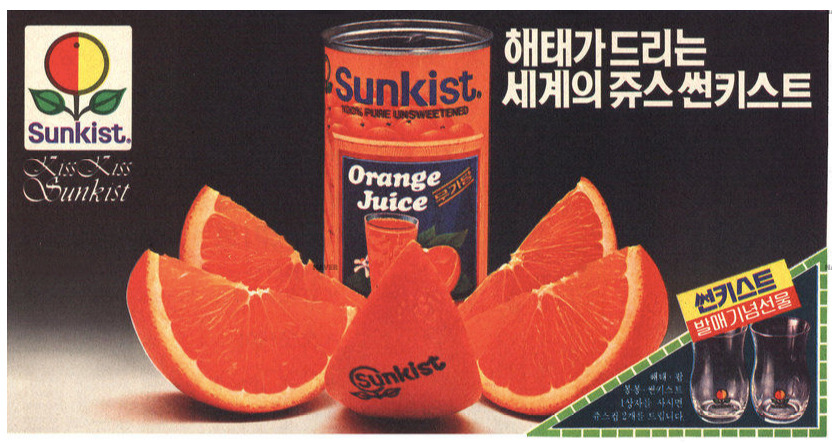 아니다. 단지 오렌지 10%에 설레었던 우리들에게 오렌지 100이라는 숫자를 단 오렌지주스가 나타났다. 해태음료에서 '썬키스트'의 상표를 받아 오렌지주스를 출시한 것이다. 당시는 과일 흉내만 내도 주스였는데, 썬키스트의 등장으로 주스계에는 신분제도가 생겼다. 심지어 '무가당'. 당을 따로 넣지 않았다니. 읽기만 해도 건강한 느낌이 들었다.