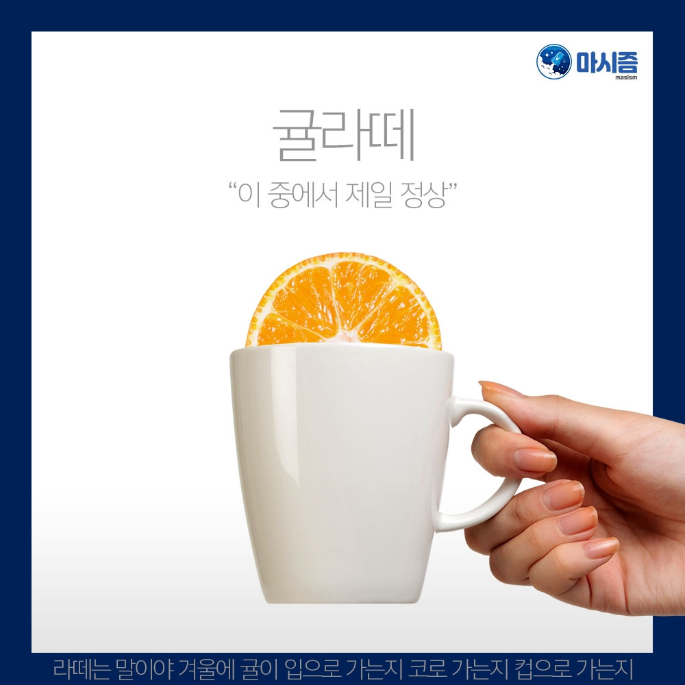아마도 가장 안전한 조합이어서 요즘 뜨고 있는 게 아닐까. 귤라떼(텐저린 라떼)는 겨울과 봄의 밀당 계절에서 즐겨야 할 라떼가 아닌가 싶다. 우유 거품 위에 다소곳이 자리한 귤 하며, 부드러우면서 상큼한 풍미까지. 사실 참기름라떼와 마늘라떼 같은 애들 사이에 있어서 그렇지. 밖에 나가면 한 개성 하는 라떼다.