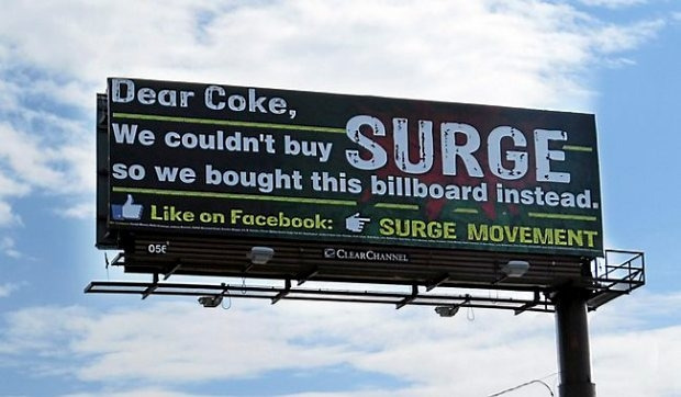 "코-크 우리는 서지를 살 수 없어서, 이 광고판을 샀어요(Dear Coke, We couldn't buy SURGE so we bought this billboard instead)"