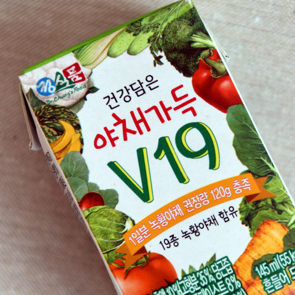 건강담은 야채가득 V19에는 컬리플라워, 오이, 케일... 19종류의 (내가 잘 안 먹는) 야채들이 들어갔다. 오직 '야채만' 들어간 것 치고는 상당히 맛이 괜찮다. 토마토 주스 맛이 나기 때문이다. 토마토 덕분에 살았지 하마터면 녹즙 될 뻔. 토마토가 과일이 아니라 채소여서 참 다행이다.