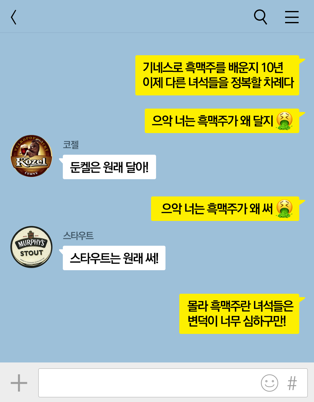 마시즘에게도 맥주적으로 순진한(?) 시기가 있었다. 흑맥주라고 하여 도수가 셀 줄 알고 마셨더니 달콤한 맛이 나서 놀라고(코젤이었다). 이번에도 흑맥주라고 해서 기대했더니 달지 않아서 또 놀란 적이 있다(기네스였다). 흑맥주면 흑맥주답게 굴어야지. 언제는 달고, 언제는 쓰고 기분 내키는 대로 만들면 장르가 어디 있어!