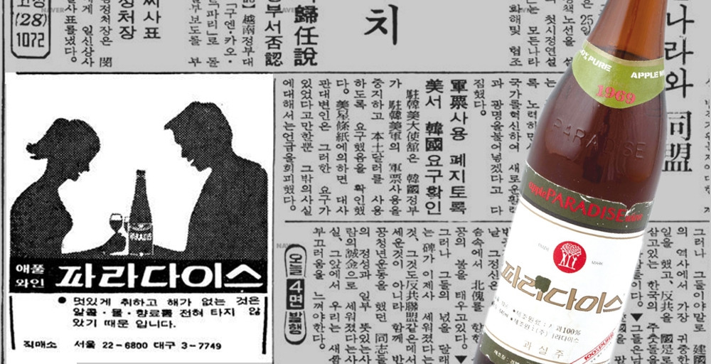 여태 쌀로 술을 만들다가 과일로 술을 만들라는 장려(라고 쓰고 지시라고 읽는다)를 받게 된 주류회사는 어떻게 되었을까? 울며 겨자 먹기였지만 와인(비슷한 것)을 만들기 시작한다. 그렇게 최초의 국내 와인이 탄생한다. 1969년 파라다이스 와인이다. 물론 포도가 아니라 사과로 만든 와인인 것이 함정.