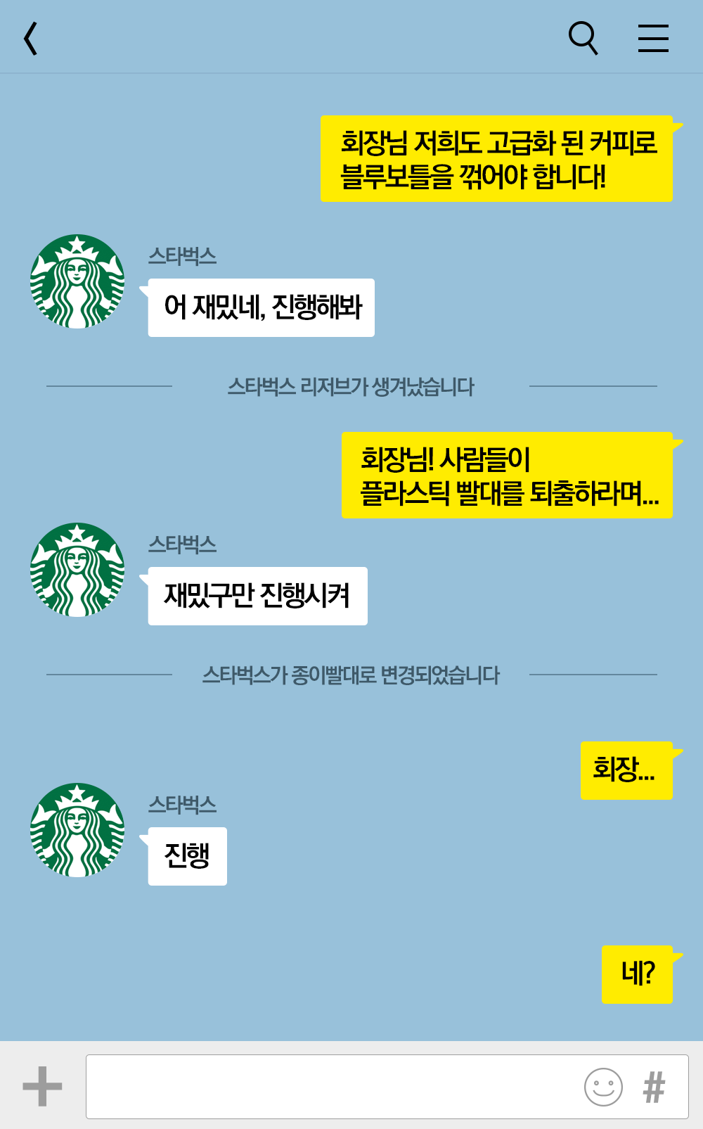 카드와 애플리케이션이 유행하자 스타벅스 메뉴 결제가 되는 시스템을 만들기도 하고. 최근에는 플라스틱 빨대 이슈가 되자 남들보다 빠르게 빨대의 사용을 포기한다. 이미 세계적으로 거대해진 브랜드가 작은 이슈에도 발 빠르게 대응을 하며 트렌드 세터의 자리를 놓지 않고 있다.