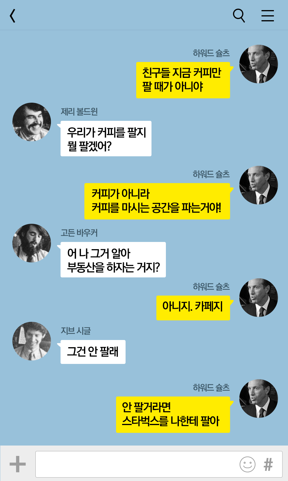초창기의 스타벅스는 우리가 아는 것과는 거리가 있었다. 스타벅스는 커피 원두를 판매하고, 커피를 직접 만들어서 판매하지는 않았다. 지금의 스타벅스를 있게 한 장본인은 '하워드 슐츠(Howard Schultz)'다.