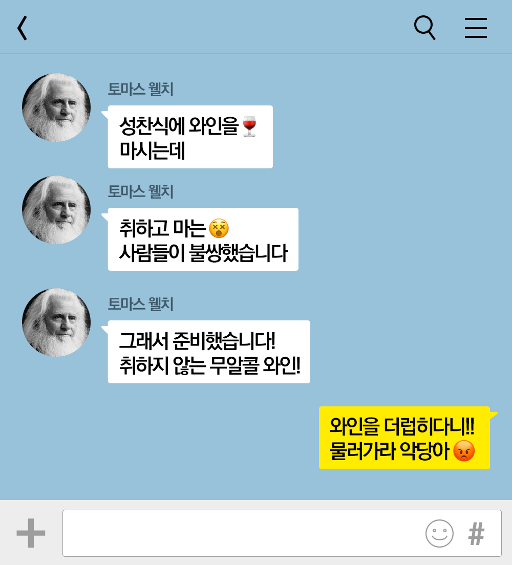 1800년대로 떠나보자. 웰치스를 만든 이의 이름은 '토마스 웰치(Thomas Bramwell Welch)'다. 토마스 웰치는 치과의사이자 독실한 신자였다. 신앙심이 투철했던 그에게 마음이 어려워지는 장면이 있었다. 바로 성찬식에 사용되는 포도주, 즉 와인이었다. 성경에는 '취하지 말라'라고 했는데 이 와인은 무엇이란 말인가?