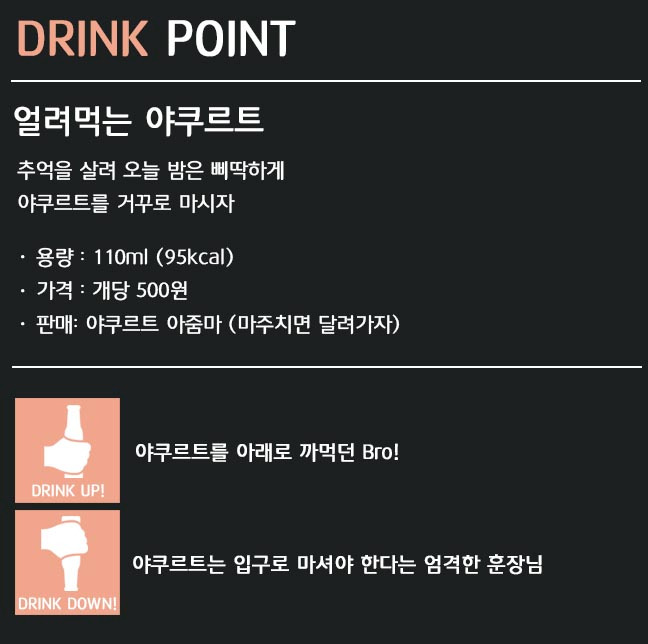 어린 시절 야쿠르트를 마시는 방법은 가지각색이었다. 야쿠르트의 은박 포장을 완전히 벗기고 마시는 깔끔파. 야쿠르트 포장에 손톱이나 이빨로 구멍을 뚫어 마시는 실속파. 마지막으로 야쿠르트 용기 아래를 이빨로 뜯어 마시는 야수파가 있었다.