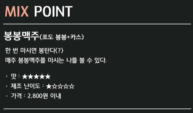 맥주는 취향에 따라 바꿔도 된다. 하지만 프리미엄 맥주들은 맛의 개성이 강해서 포도 봉봉과 따로 노는 경우가 많았다. 오히려 청량감은 강하지만 맛에 대한 개성이 아쉬웠던 카스, 하이트가 섞어마셨을 때 가장 맛있었다. 카스, 하이트 짱! 다시는 한국 맥주를 무시하지 말자.
