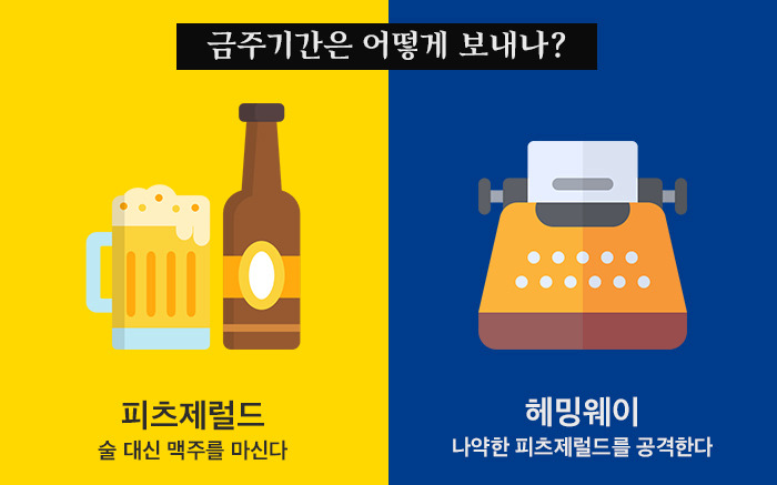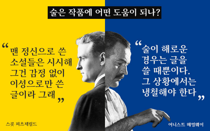 노벨문학상 수상자들은 6명 중에 4명이 알콜중독자다. 심지어 알콜중독으로 사망하는 직업으로 바텐더에 이어 작가가 2위를 차지했다는 연구결과도 있었으니. '작가란 마시는 게 본업이고, 글을 쓰는 게 부업인가'라는 합리적 추론을 하게 되었다. 그래서 오늘은 2명의 위대한 작가들의 술자리를 염탐해보기로 한다.